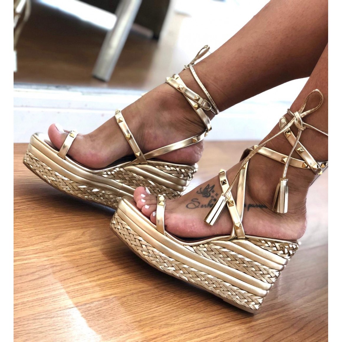 ANABELA DOURADA COM TIRAS, DETALHES EM SPIKE AMARRAÇÃO NO TORNOZELO, SALTO DE 10CM.
