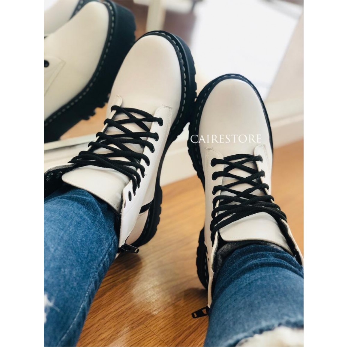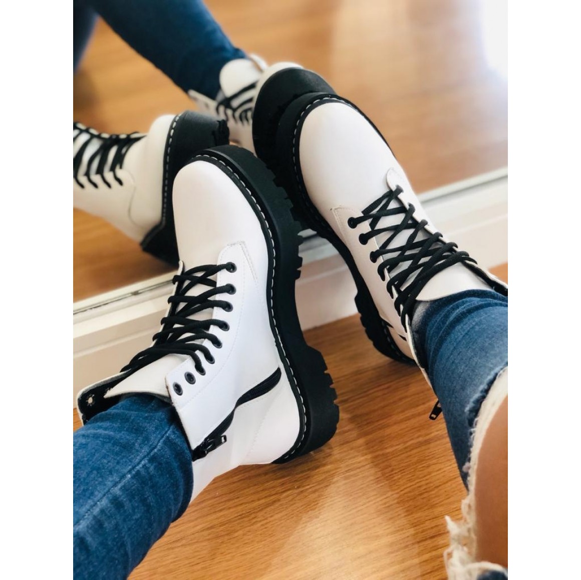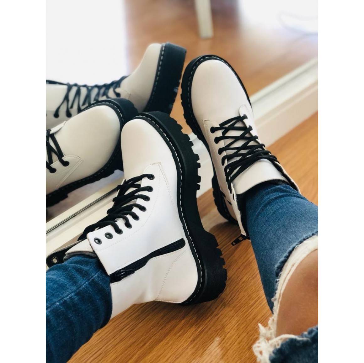 COTURNO EM COURO ECOLOGICO BRANCO, SOLADO EMBORRACHADO DE 3,5CM, CANO BAIXO DE 15CM, AJUSTE EM ZIPER E CADARÇO.